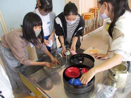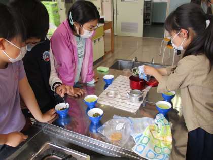 家庭科の学習でお茶をいれました。食器を洗い、お湯を沸かすところから始めました。協力しながら、上手にいれることができました。