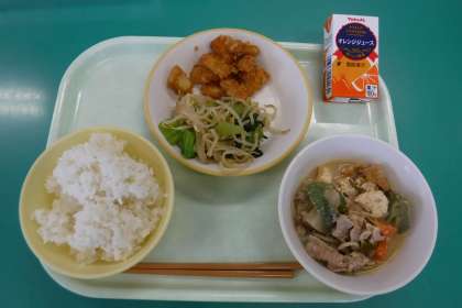 ・ご飯 ・オレンジジュース ・いかのカリン揚げ ・もやしのお浸し ・豚肉と大根の胡麻味噌煮 です。