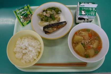 ・ご飯 ・牛乳 ・鰯のショウガ味 ・野菜ソテー ・ジャガイモのそぼろ煮 ・抹茶大豆 です。