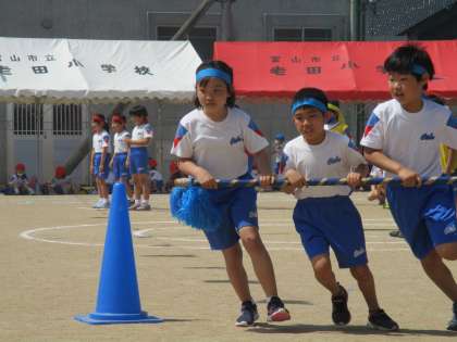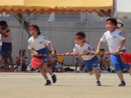 全力で80mを走ることができました。「台風の目」では、3人の心を合わせながら、1本の棒を上手に運ぶことができました。どちらも力を出し切ることができ、子供たちは笑顔いっぱいでした。