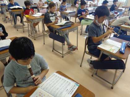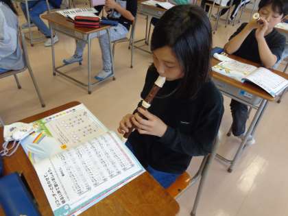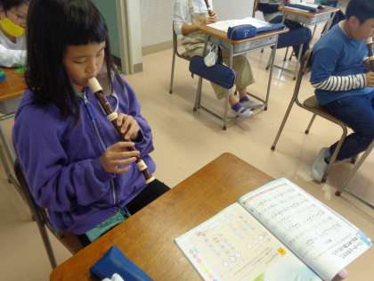 音楽科「歌のにじ」では、リコーダーの演奏の練習をしました。低い「ファ」や「ミ」の音に苦戦しながらも、一生懸命にリコーダーを吹いていました。