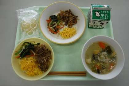 5月20日(木) 本日の給食 公開日 2021/05/20 更新日 2021/05/20 今日のひとコマ 今日の献立は、 ・ビビンバご飯(焼き肉・ナムル・錦糸卵) ・牛乳 ・味噌汁 ・冷凍ラフランス です。 どんぶり形式でいただくビビンバご飯は、子供たちに大人気でした。
