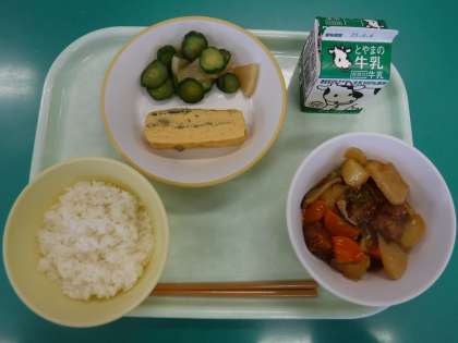 ・ご飯 ・牛乳 ・エゴマ入り卵焼き ・華風和え ・酢豚 です。