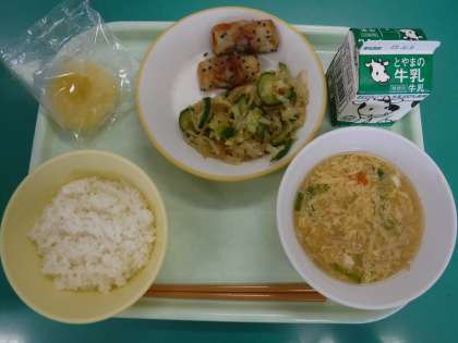 ・ご飯 ・牛乳 ・竹輪の南部揚げ ・春雨サラダ ・かき玉汁 ・冷凍リンゴ です。