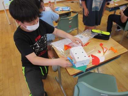 くるくる回るクランクに思い思いの飾りを付けています。魚の泳ぐ様子、ブランコをこいでいる様子など、クランクの仕組みを生かして楽しい作品を作っています。
