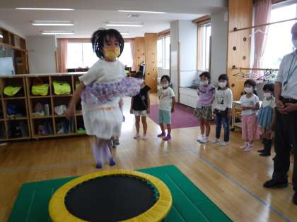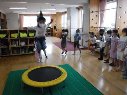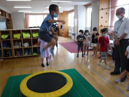 昨日から楽しみにしていた1年生が、早速トランポリン遊びに興じました。1年生も順番や回数などの使い方ルールをきちんと守るよい子たちです。
