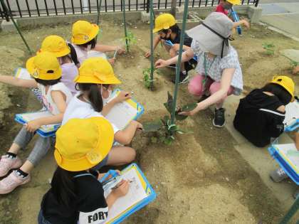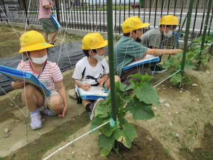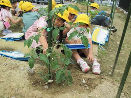 毎日の水やりに加え、雑草むしりやわき芽摘み等、野菜の成長を楽しみにお世話に励んでいる2年生です。ミニトマトチームが実がなっているのを発見し、クラスみんなで大喜びで観察していました。