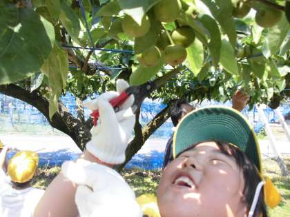 また、代表者は摘果体験をさせていただきました。初めての体験に子供たちは緊張や喜びの表情を浮かべ、とても楽しんでいる様子でした。