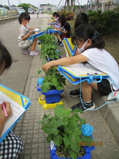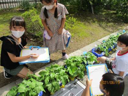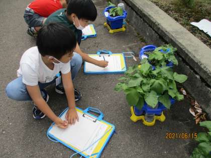 6月15日(火) 1年生 生活科「あさがおとなかよし」 公開日 2021/06/15 更新日 2021/06/15 1年生 生活科の時間にアサガオの観察をしました。 「大人の葉っぱが大きくなっていたよ」「私の手より大きいよ」「触ったら、ふわふわするね」と大きく成長してきたアサガオの様子を友達と話しながら観察しました。