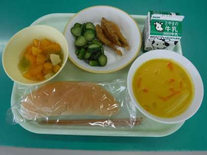 6月16日(水) 本日の給食 公開日 2021/06/16 更新日 2021/06/16 今日のひとコマ 今日の献立は、 ・コッペパン ・牛乳 ・わかさぎのフリッター ・グリーンサラダ ・カボチャポタージュ ・フルーツゼリーミックス です。 カボチャポタージュには、ジャガイモや人参も入っていて食べ応えがありました。