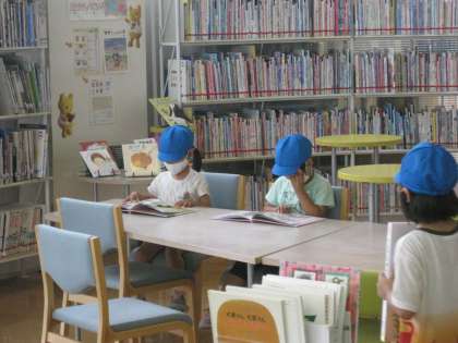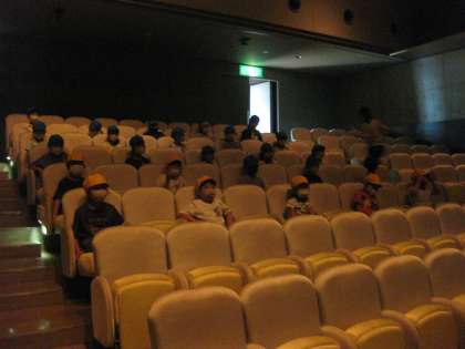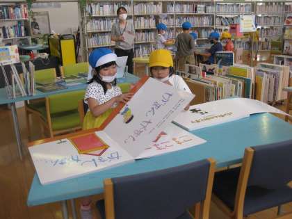 大島絵本館では、二組に分かれ、シアターやライブラリーの見学、ワークショップを行いました。