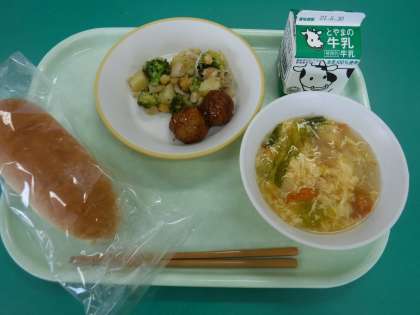 6月23日(水) 本日の給食 公開日 2021/06/23 更新日 2021/06/23 今日のひとコマ 今日の献立は、 ・米粉コッペパン ・牛乳 ・ミートボール ・ひよこ豆のオリーブオイル炒め ・卵とレタスのスープ です。 オリーブオイルとニンニクが効いたひよこ豆には、ジャガイモやブロッコリー、トウモロコシも使われており、レストランに出てくるような一品でした。