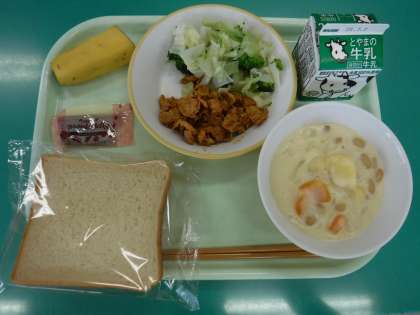 ・食パン ・牛乳 ・ポークチャップ ・添え野菜 ・蕪のシチュー ・バナナ ・メープルシロップ です。