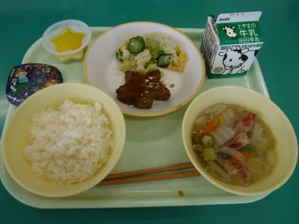 7月2日(金) 本日の給食 公開日 2021/07/02 更新日 2021/07/02 今日のひとコマ 今日の献立は、 ・ご飯 ・牛乳 ・星形ハンバーグ ・コーンサラダ ・天の川スープ ・七夕デザート です。 今日は七夕にちなんだメニューで、子供たちは大喜びでした。