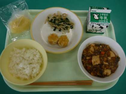 ・ご飯 ・牛乳 ・麻婆豆腐 ・人参シューマイ ・ナムル ・冷凍リンゴ です。