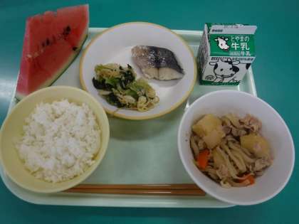 7月9日(金) 本日の給食 公開日 2021/07/09 更新日 2021/07/09 今日のひとコマ 今日の献立は、 ・ご飯 ・牛乳 ・肉じゃが ・鰆の塩焼き ・はりはり和え ・スイカ です。 今日のスイカも調理員さんの腕が光る切り方でした(薄くてもスイカは立っています)。 スイカはとてもみずみずしく甘くて美味しかったです。