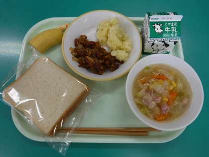 9月1日(水) 本日の給食 公開日 2021/09/01 更新日 2021/09/01 今日のひとコマ 今日の献立は、 ・食パン ・牛乳 ・チリコンカン ・粉ふきいも ・野菜スープ ・棒チーズ ・バナナ です。 チリコンカンをパンに挟み、サンドイッチにして食べている子供もいました。
