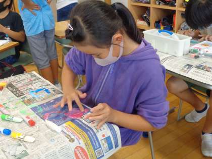 図画工作科では、正方形の紙に指を使って絵の具を混ぜ合わせました。マーブルにしたりかすれさせたりと工夫をして表現していました。個性的な作品が複数できました。