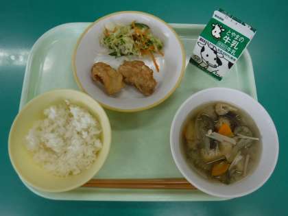 9月2日(木)本日の給食 公開日 2021/09/02 更新日 2021/09/02 今日のひとコマ 今日の献立は、 ・ご飯 ・牛乳 ・鶏肉の米粉揚げ ・コールスローサラダ ・なすの味噌汁 です。 さくさくの米粉揚げがとても美味しかったです。