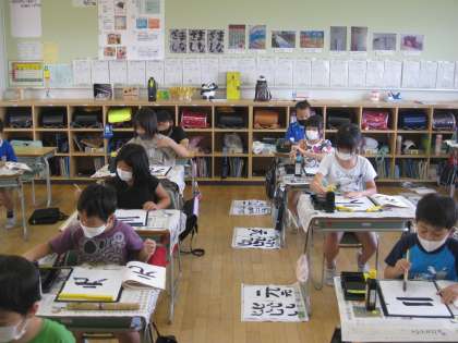 書写では、毛筆で「元」という字を練習しました。4画目の曲がりが難しいので、はじめに何度も練習しました。力の入れ方に気をつけながら、ゆっくりと丁寧に書きました。清書では「もう少し大きく書けばよかった」「線が細くなってしまった」という声が聞こえてきましたが、手本と見比べながら書いている姿でした。