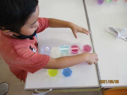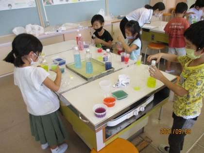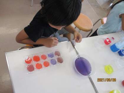 9月9日(木)カラフルいろみず 公開日 2021/09/09 更新日 2021/09/09 1年生 図画工作科「カラフルいろみず」でたくさんの色水を作りました。 用意した赤、青、黄の三色の絵の具から、水の量や混ぜ方を工夫すると数え切れない色を作ることができ、子供たちも大満足でした。「おいしそう」「この色、好き」と感想を言い合いながら楽しみました。
