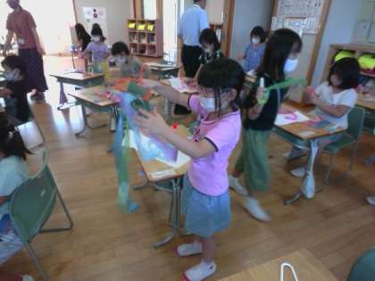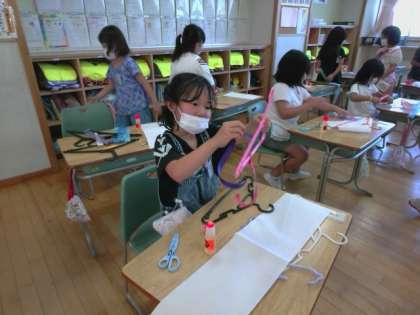 図画工作「ひらひらゆれて」では、ハンガーにひらひらと揺れるよう考えて飾り付けをしました。カラフルにする子や、長いテープを使う子、絵を描く子等、思い思いの作品を作り上げていました。