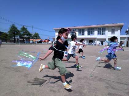 作り終えた後にはグラウンドで作品を片手にはためかせる元気な1年生たちでした。