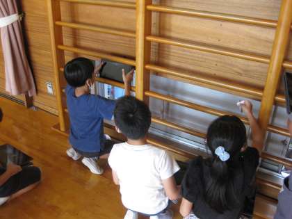 9月16日(木) 3年生 小さな自分 公開日 2021/09/16 更新日 2021/09/16 3年生 図画工作科「小さな自分のお気に入り」では、自分の姿・全身を写真に撮り、小さな自分を作りました。その小さな自分を学校の中のお気に入りの場所で遊ばせるようにして、タブレットで写真を撮りました。子供たちは、ランドセルや文房具で遊具を作ったり、図書室の本の中に小さな自分を隠してみたりして、工夫して撮影していました。