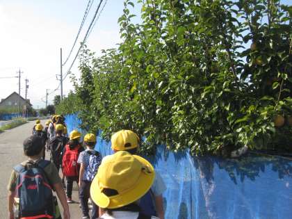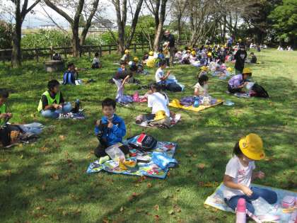 朝から遠足を楽しみにしていた子供たちは、笑顔いっぱい。往復約5キロメートルの長い道のりでしたが、なかよし班の人たちと励まし合いながら、最後まで歩くことができました。