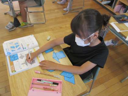 図形を並び替えて、教科書に載っている形と同じ形を作る活動では、形の特徴を捉えながら、みんな真剣に考えていました。これから三角形と四角形の特徴について詳しく学習していく予定です。