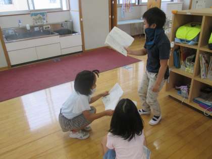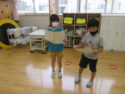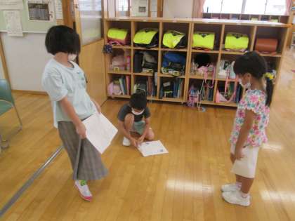 国語科では「お手紙」の登場人物になりきって、音読げきをする練習をしています。がまくんやかえるくんになりきるために、場面の様子を想像し、声の大きさや動きなどを工夫して何度も音読に励んでいます。