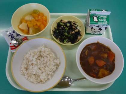 10月4日(月) 本日の給食 公開日 2021/10/04 更新日 2021/10/04 今日のひとコマ 今日の献立は、 ・麦ご飯 ・食べキリンハヤシ ・大豆とひじきのサラダ フルーツゼリーミックス ・味付け小魚 です。 ハヤシには、トマトピューレ、ウスターソース、赤ワイン、醤油などが隠し味に使われ、とても美味しかったです。