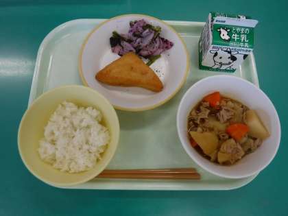 10月7日(木) 本日の給食 公開日 2021/10/07 更新日 2021/10/07 今日のひとコマ 今日の献立は、 ・ご飯 ・牛乳 ・肉じゃが ・はんぺんフライ ・ゆかり和え です。 はんぺんのフライは、滅多に出ない献立です。
