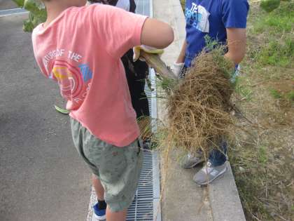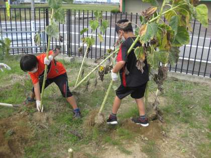 理科の学習で観察し育ててきたヒマワリやオクラ、ホウセンカが枯れてきたので、種とりをして畑を片付けました。子供たちは大きく成長したヒマワリを根から抜くことに苦戦していましたが、力を合わせてきれいに抜けました。根も大きく育っていることに驚いていました。