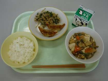 10月8日(金) 本日の給食 公開日 2021/10/11 更新日 2021/10/11 今日のひとコマ 今日の献立は、 ・ご飯 ・牛乳 ・海老と豆腐のうま煮 ・焼き餃子 ・ナムル です。 焼き餃子が人気でした。