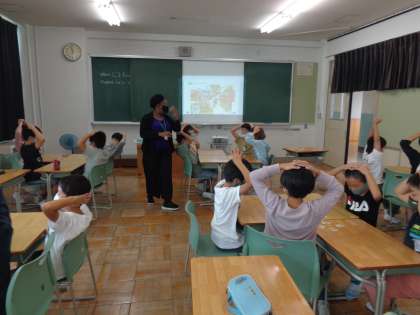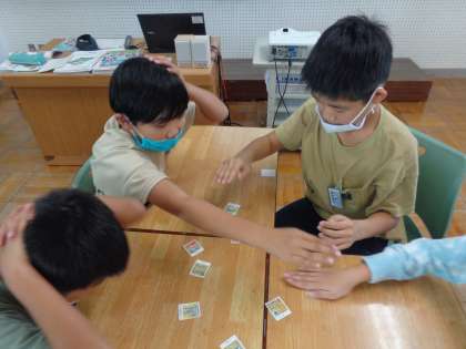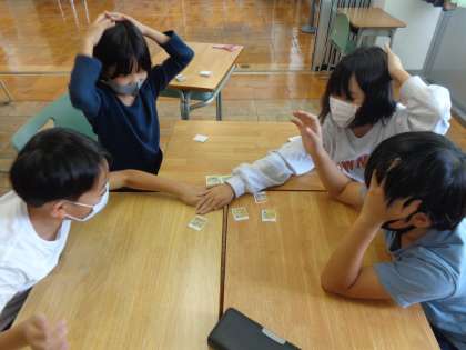 外国語活動の時間では、アルファベットの小文字の学習をしました。ALTの発音をよく聞き、英単語のカルタに挑戦しました。楽しみながら英単語に慣れ親しんでいる様子でした。