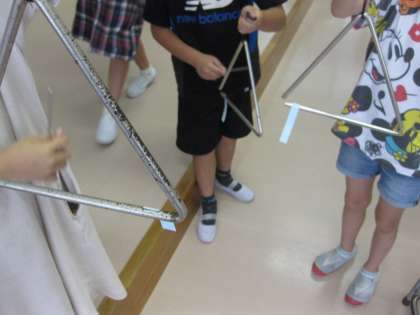 理科「音を出して調べよう」では、楽器に付箋を貼り、音を出したときに付箋がどのようになるかを調べました。細かく震えていることを観察しました。