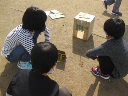 理科「太陽の光を調べよう」では、鏡で反射させた光の明るさと温度を調べました。子供たちはグループで協力して温度計の温度を読み取ったり、光を一カ所に集めたりしていました。