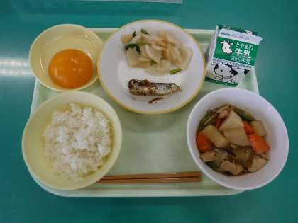 10月19日(火) 本日の給食 公開日 2021/10/20 更新日 2021/10/20 今日のひとコマ 今日の献立は、 ・ご飯 ・牛乳 ・大根と鶏肉のうま煮 ・鰯の生姜味 ・蕪の彩り ・桃缶 です。 桃缶が人気でした。