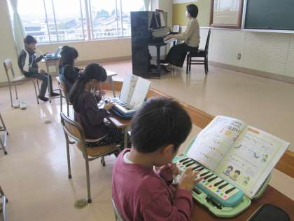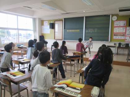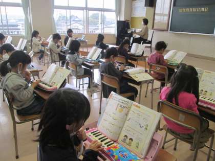 音楽科では、拍のリズムに合わせて、歌ったり演奏したりする学習をしています。新しく8分音符のリズムを覚えて、楽しそうに歌っていました。
