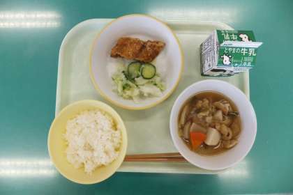 10月26日(火) 本日の給食 公開日 2021/10/26 更新日 2021/10/26 本日の給食 今日の献立は、 ・ご飯 ・牛乳 ・さかなの竜田揚げ ・添え野菜 ・根菜汁 です。 やさしい味わいの根菜汁は、じんわりと旨味が体に染みわたります。