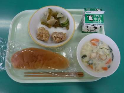 10月27日(水) 本日の給食 公開日 2021/10/27 更新日 2021/10/27 今日のひとコマ 今日の献立は、 ・コッペパン ・牛乳 ・フライドチキン ・茎わかめのサラダ ・ホタテのクリーム煮 です。 フライドチキンが、大人気でした。
