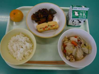 10月28日(木) 本日の給食 公開日 2021/10/28 更新日 2021/10/28 今日のひとコマ 今日の献立は、 ・ご飯 ・牛乳 ・白菜鍋 ・ちぐさ焼き ・カボチャのいとこ煮 ・ミカン です。 「いとこ煮」は本日カボチャと小豆が使われていましたが、日本各地で合わせる食材や味付けが変わるそうです。