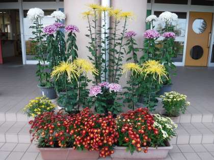 地域の方が丹精込めて育てられた菊の花鉢が、今年も玄関を彩っています。ありがとうございます。