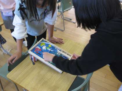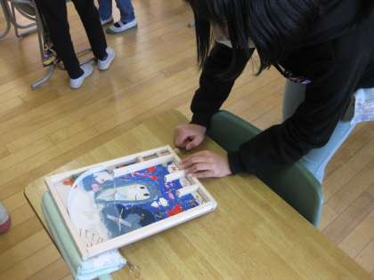 図画工作科「くぎうちトントン」で作ったコリントゲームを自分で楽しむだけでなく、友達の作品も楽しみました。くぎの打ち方や点数の付け方の違いで、難易度が変わってくるため、子供たちはたくさんの友達のゲームを楽しんでいました。