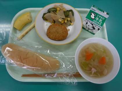 11月10日(水) 本日の給食 公開日 2021/11/10 更新日 2021/11/10 今日のひとコマ 今日の献立は、 ・コッペパン ・牛乳 ・豆とカボチャのコロッケ ・大根サラダ ・キャベツスープ ・棒チーズ ・バナナ です。 パンは週に1回が基本です。久しぶりのコッペパンは、柔らかくて美味しかったです。