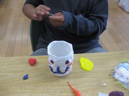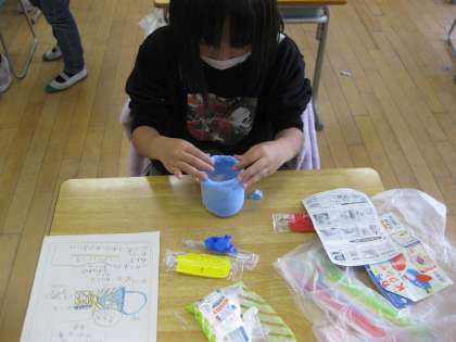 図画工作科「空き容器の変身」では、紙粘土を色づけして容器に貼り付けて、小物入れや鉛筆立てを作りました。子供たちは、紙粘土の感触を楽しみながら工夫して作っていました。