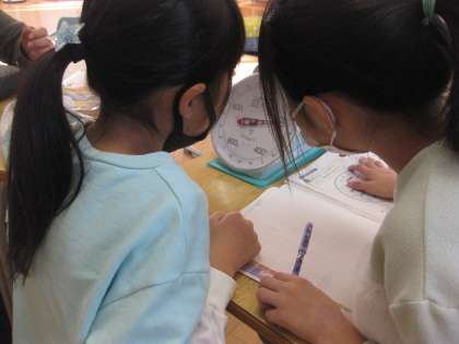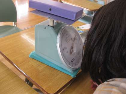 算数科「重さをはかって表そう」では、はかりを使って身の回りの物の重さを調べました。子供たちは、グループの友達と協力して目盛りを読み取り、ノートに重さを書いていました。