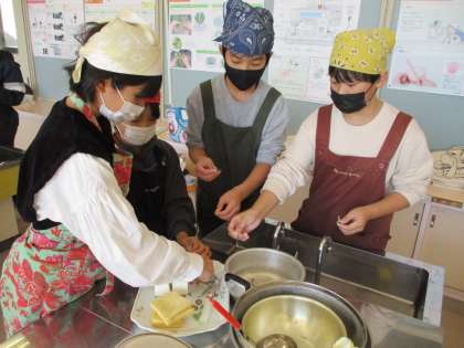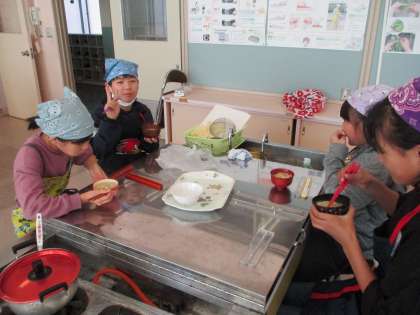 出汁からとって、みそ汁をつくりました。煮干しを下処理したり具材を切ったりするなどグループで協力しました。おいしくできたようで、喜んでいただいていました。