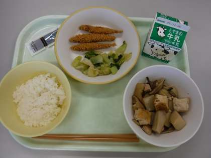 11月19日(金) 本日の給食 公開日 2021/11/19 更新日 2021/11/19 今日のひとコマ 今日の献立は、 ・ご飯 ・牛乳 ・里芋と厚揚げのうま煮 ・きびなごのさくさく揚げ ・梅肉和え ・のり佃煮 です。 きびなごはメニュー通り、さくさくでした。